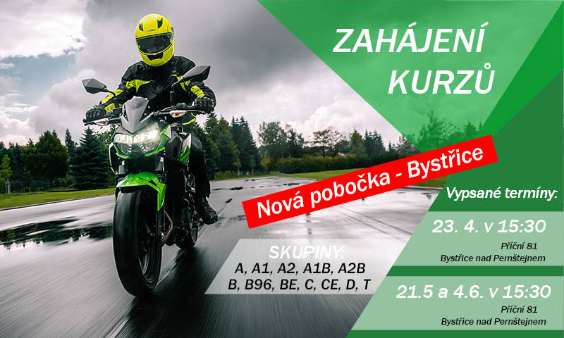 Zahajujeme kurz pro všechny skupiny: B, B96, BE, C, CE, D, T, A, A1, A2, A2/B, A1/T a další kombinace dne: 23.4.2026 21.5.2026 4.6.2026 vždy od 15:30h v Bystřici nad …Více
