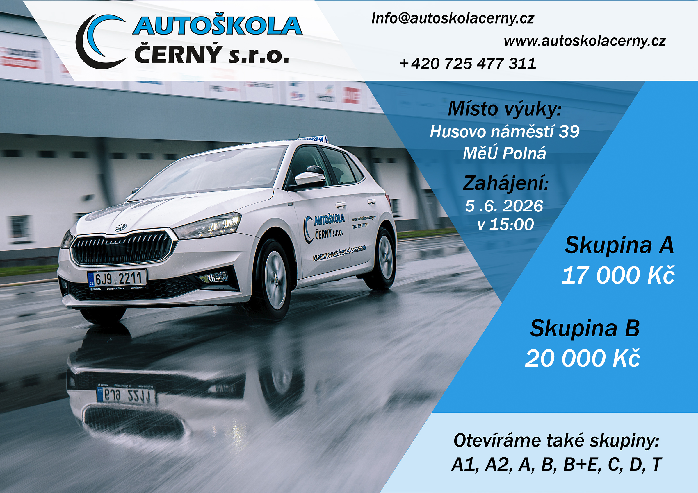 Zahajujeme kurz pro všechny skupiny: B, B96, BE, C, CE, D, T, A, A1, A2, A2/B, A1/T a další kombinace dne 5.6.2026 v 15:00 v Polné, Husovo nám. 39.Více